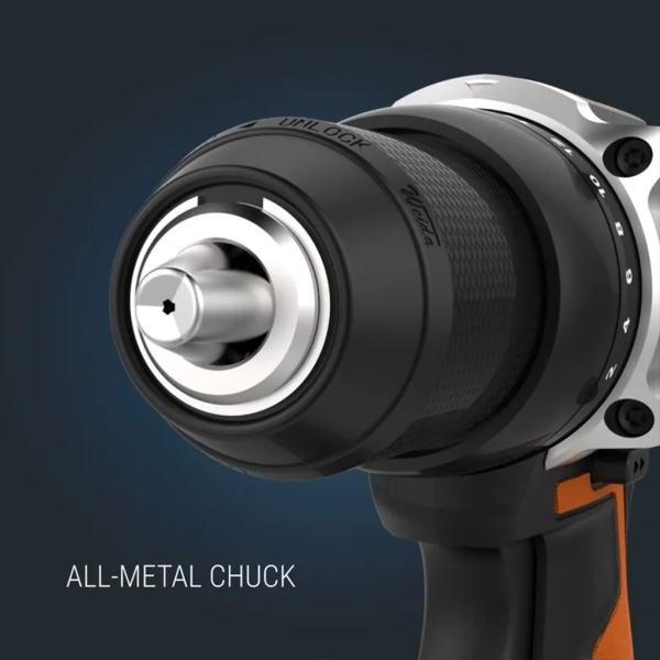 Heavy-duty 13mm chuck with safety lock and all-metal gears for increased
